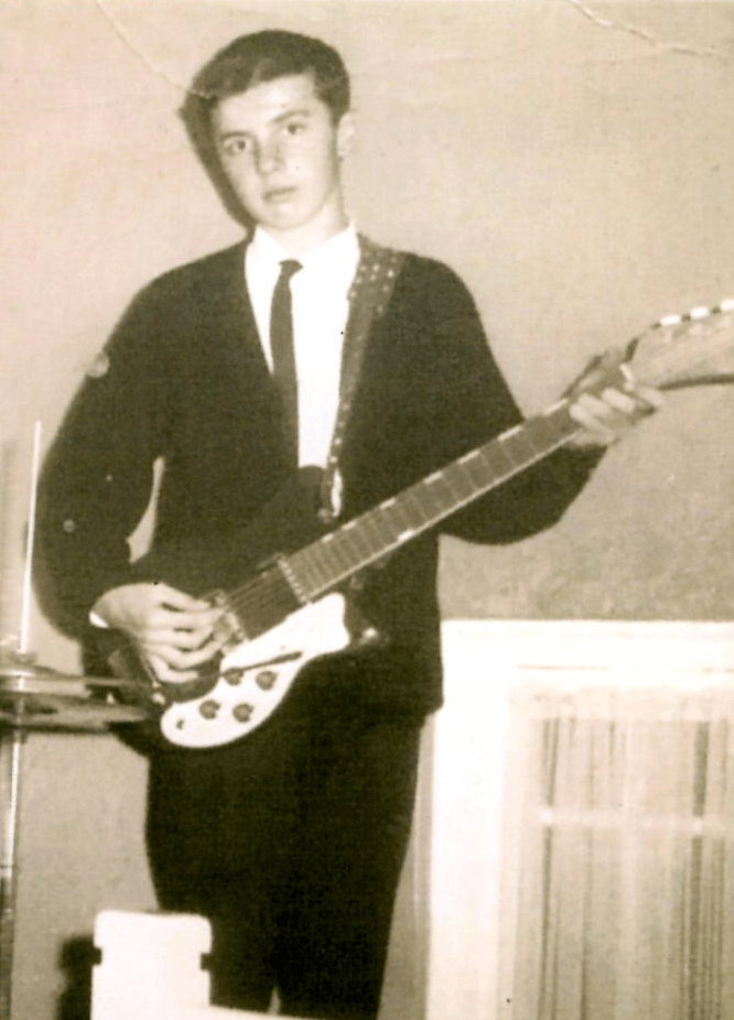 My brother Owen (Oz) got an acoustic guitar in maybe 1962 when he was about 14 and I was 15. We’d become interested listening to records by the Shadows (Apache, The FBI, The Boys, Wonderful Land etc) and Duane Eddy (Rebel Rouser) and other guitar bands predominantly, and we had to have a go! Oz is right handed, I’m a leftie, but I used to pick up his guitar and play around anyway, holding it upside down and back to front. Eventually I got one of my own. The strings must have been half an inch off the frets, but I could change them around, packing out the buzzes on the nut and bridge with bits of cardboard or matchsticks, and I was on my way! I never had lessons–just learnt chords from diagrams and we would buy sheet music when we could afford it.